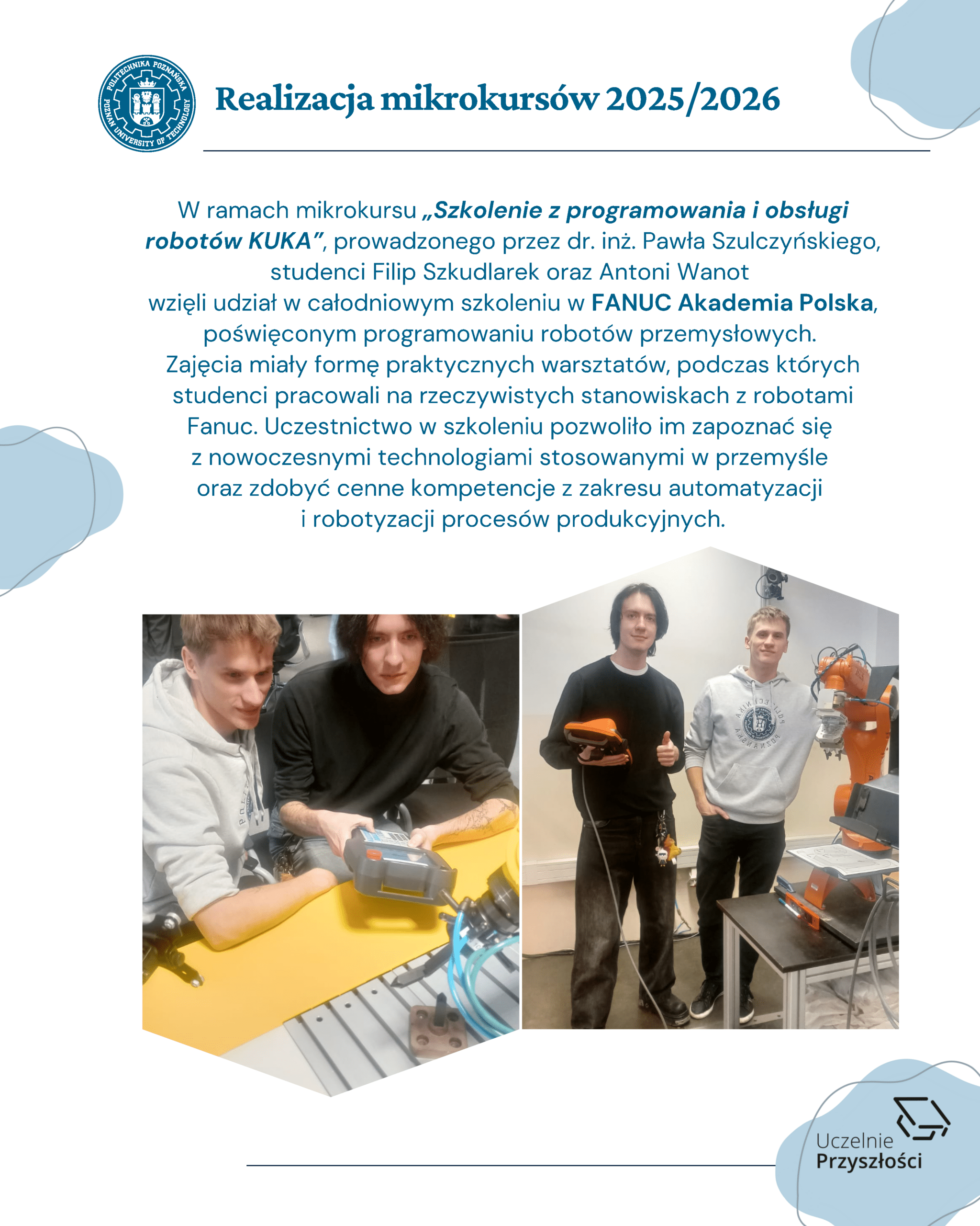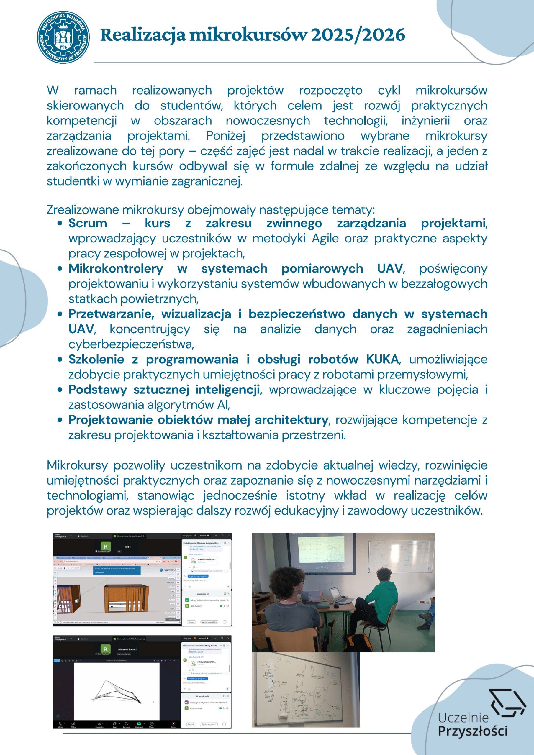 Zakres tematyczny mikrokursów obejmuje między innymi zagadnienia z nowoczesnych technologii, w tym sztucznej inteligencji, a także zarządzania, systemów pomiarowych oraz kompetencji miękkich. Dzięki temu uczestnicy poszerzą swoje umiejętności w kluczowych obszarach rozwoju zawodowego i edukacyjnego, co będzie stanowiło wartość dodaną dla realizowanych projektów.